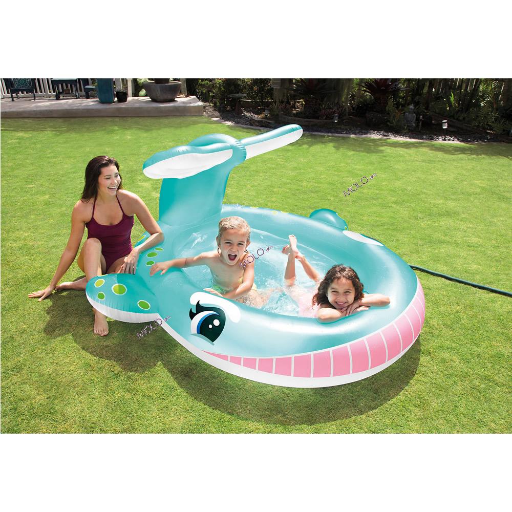 Детский надувной бассейн с распылителем в виде очаровательного Китёнка от компании Интекс понравится каждому ребенку. Небольшой фонтанчик, бьющий из его хвоста, не только поможет освежиться в жаркий летний день, но так же приведёт малышей в восторг своими брызгами. Для работы фонтана вам понадобится обычный садовый шланг, который нужно подключить к специальному отверстию. Надувной бассейн для детей имеет клапан для удобства слива воды.